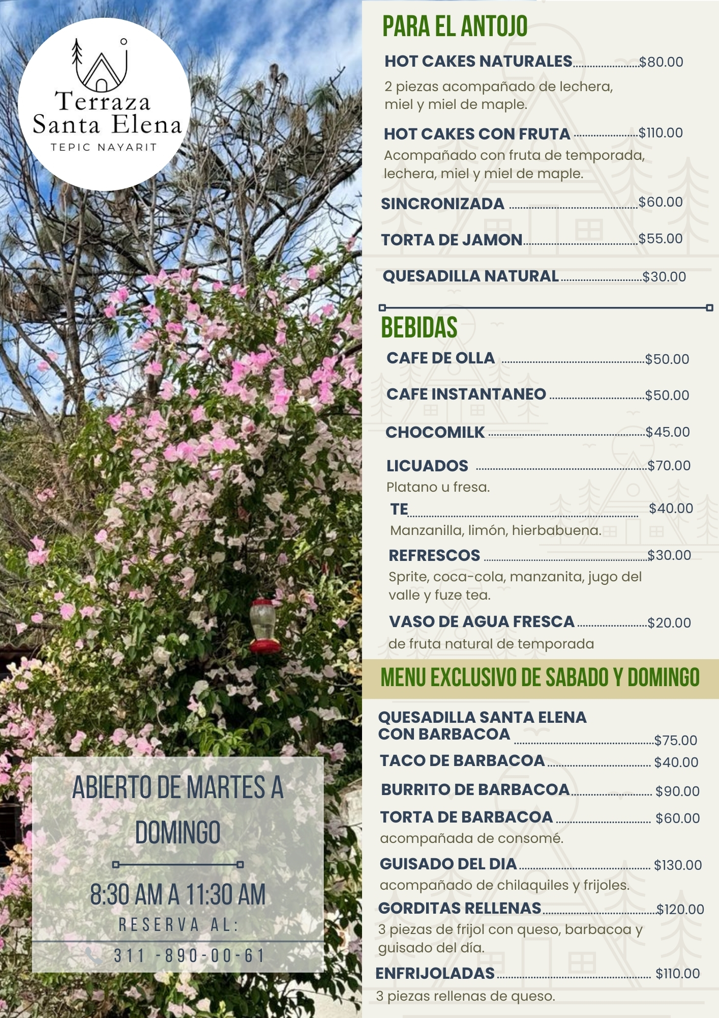 Disfruta de un desayuno con vista inigualable en nuestro restaurante Terraza Santa Elena, ubicado dentro de las instalaciones de las Cabañas San Carlos.
